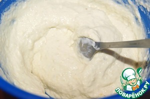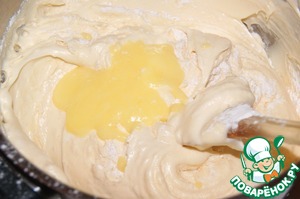 Добавить в два приема муку и масло, перемешать лопаткой методом складывания снизу вверх и по кругу.