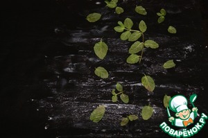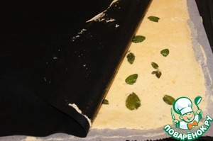 Противень 30х35 см застелить пекарской бумагой. Нанести на половину площади бумаги тонюсенький слой сливочного масла и выстелить по ее поверхности листочки мяты "лицом" вниз, слегка прижав их, чтобы они пристали и не сдвинулись при распределении теста.