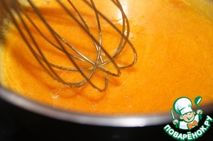 Смешать желтки с сахаром (35 г) и поместить на паровую баню, постоянно взбивать венчиком до пышной пены, нагревать до температуры 45"С, не больше. Снять с огня.