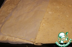 С готового бисквита аккуратно снять бумагу сначала сверху.