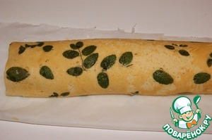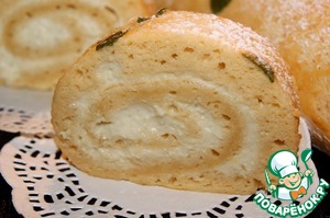 Осторожно развернуть остывший бисквит и, смазав кремом, свернуть в рулет (свертывать начинаем со стороны, где нет листочков мяты).