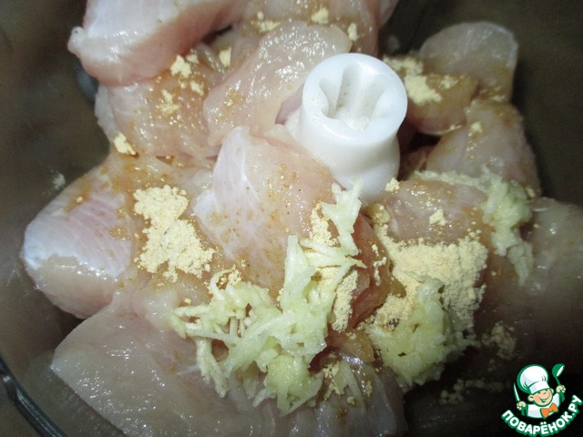 Филе индейки порезать на кусочки, добавить натёртый чеснок, соль, можно добавлять любую зелень на Ваш вкус. Так же отжать замоченный в молоке хлеб и смешать ингредиенты при помощи любого приспособления))а можно и руками. Я пробила в блендере.