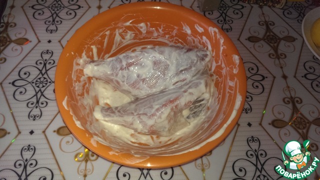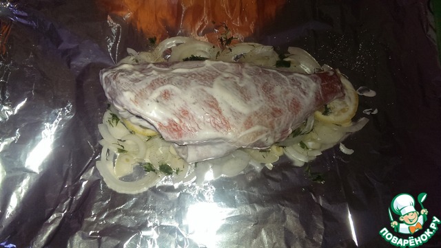 Маринуем окунь. Добавляем майонез, соль и смесь перцев. Отставляем в сторону и подготавливаем подложку