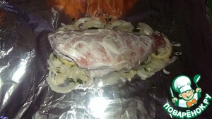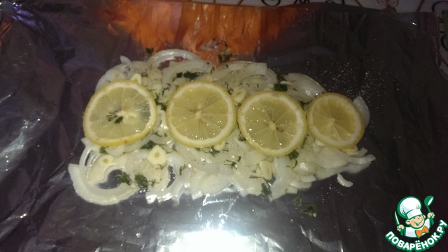 Укладываем рыбу. Сверху в обратном порядке: 2 полукружка лимона, чеснок, зелень, лук, соль, перец.