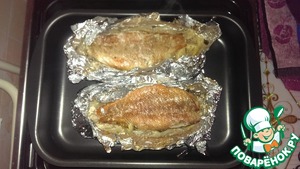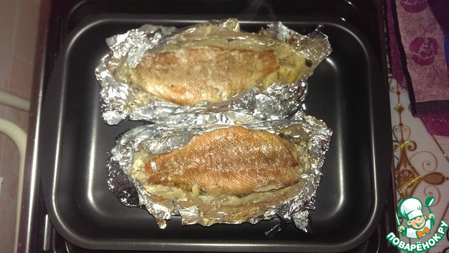 Заворачиваем в фольгу и в духовку на 25-30 минут при температуре 180-200 градусов. Для зажаристого верха аккуратно раскрыть рыбу и поставить еще на 10 минут.