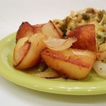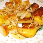 Как только лук приготовится, добавить в сковороду картофель, соль-перец по вкусу, приправу. Обжаривать с каждой стороны до румяной корочки.