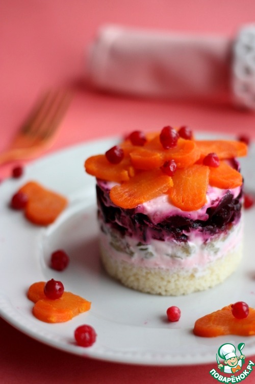 Симпатично, Заюшка! Я давно делаю салат "Манон"-как шуба-но с маринованными огурчиками. А вот с кус кусом-оно интересно вышло!