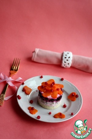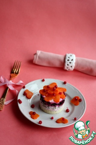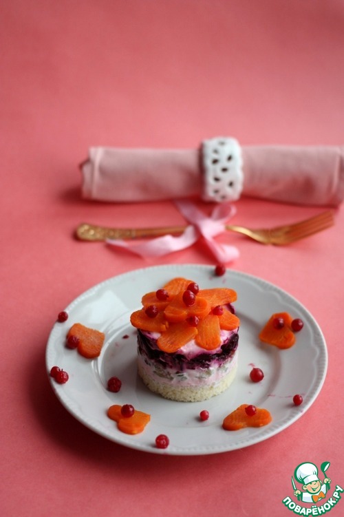 • Майонез (майонез+сметана) взбить с ягодами. Огурцы натереть на крупной тёрке. Свеклу и морковь очистить и натереть тоже на крупной тёрке. Я в этот раз морковь не тёрла и сделала слоем украшения в виде сердечек.