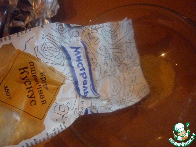 Кускус залить 250 мл воды и закрыть крышкой на 7 минут.