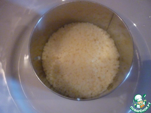 • Когда кускус будет готов, выкладываем салат слоями ( я сделала 2 порционных и 1 большой салат):