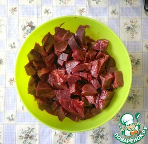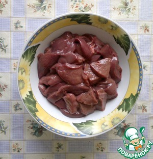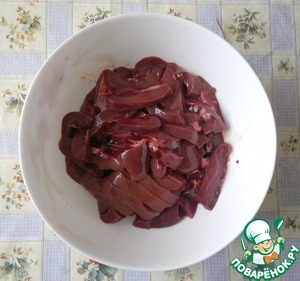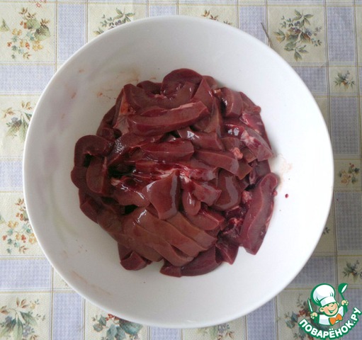 Все потроха хорошо промыл и порезал таким образом: почки порезал крупной соломкой, как на бефстроганов,