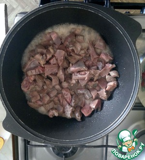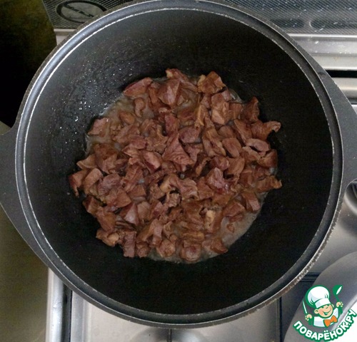 Разогреваю в казане растительное масло, что называется "до звона", и закладываю туда сердце. Вот тут-то вы и услышите тот самый звук, который и послужил названием этому блюду ))) Сердце обильно выделяет сок, поэтому я убавляю огонь и тушу сердце в собственном соку до его испарения.