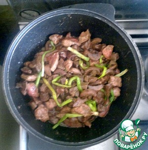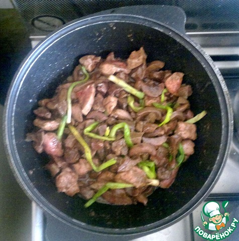 И, наконец, печень. Солю, перчу, всё хорошо перемешиваю. С этого момента готовится тжвжику остаётся минут 10, т. е. до готовности печени. Даже и семи минут достаточно, иначе печень зачерствеет. После выключения огня засыпаю в казан зелень и даю настояться ещё минут 15. Тут и сказочке конец, а кто кушал - молодец! )))