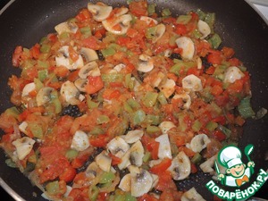 Пока тесто подходит, приготовить начинку. Лук очистить, нарезать тонкой соломкой и слегка обжарить на растительном масле. Добавить к нему нарезанные мелким кубиком перцы, затем помидоры и грибы, нарезанные тонкими слайсами, добавить специи по вкусу, немного потушить и отставить.