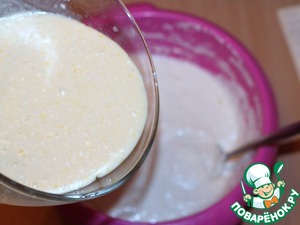 5. Выливаем яичную смесь к манке. Тщательно вымешиваем тесто. Тесто получается жидкое, как на блины.