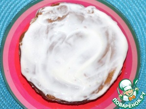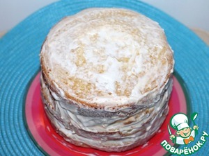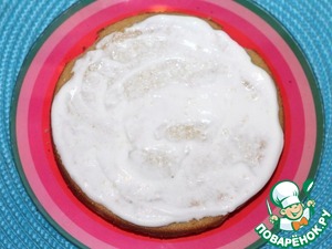 10. Взбиваем сметану (у меня баночка 180 г) с 2-3 ст. сахара, по вкусу. И смазываем верхушку у двух срезанных коржей, даем немного времени пропитаться. Лишнюю сметану с коржей не убирать.