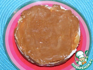 11. Затем берем вареную сгущенку (покупайте только в баночке, она гуще) и раскладываем маленькой ложкой на 2 коржа поверх сметаны. 1/3 часть варенки оставляете на верх тортика.