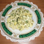 Зелень, кальмары, яйца - порезать. Перемешать с рисом. Заправить майонезом