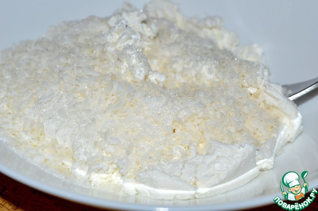• Творог размять, смешать с сахарной пудрой и кокосовой стружкой.