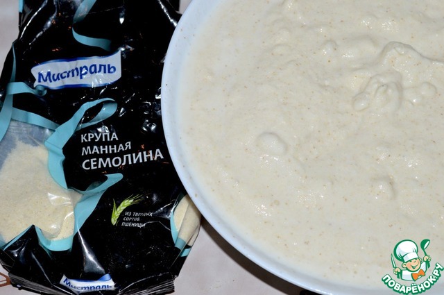 • Манную крупу залить кефиром и дать набухнуть 30-40 минут.