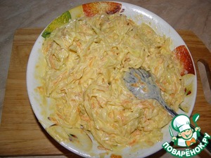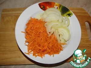 Морковь натереть на крупной терке, лук нарезать полукольцами.