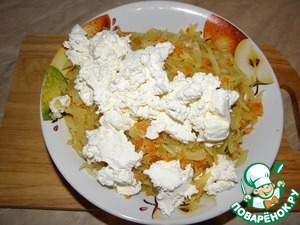 Творог размять, добавить к капустной массе, хорошо перемешать. Проверим на свои любимые специи.