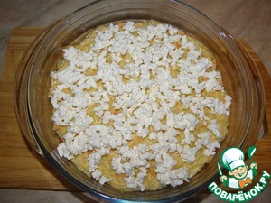 Брынзу ( или другой сыр) натереть на терке, посыпать весь верх. Разогреть духовку 170-180%. И поставить готовиться на 25-35 минут. (смотреть по готовности, не пересушить) Затем достать, дать остыть, и извлечь из формы.