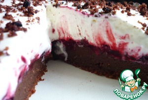 11. Желатин замочить в воде, распустить в микро и немного остудить. Сливки взбить (положить сливки, насадки и форму для взбивания на несколько минут в морозилку-сливки лучше взобьются). Ввести в сливки желатин, взбивая и вылить на торт поверх ягод. На сливки посыпать бисквитной крошкой -
