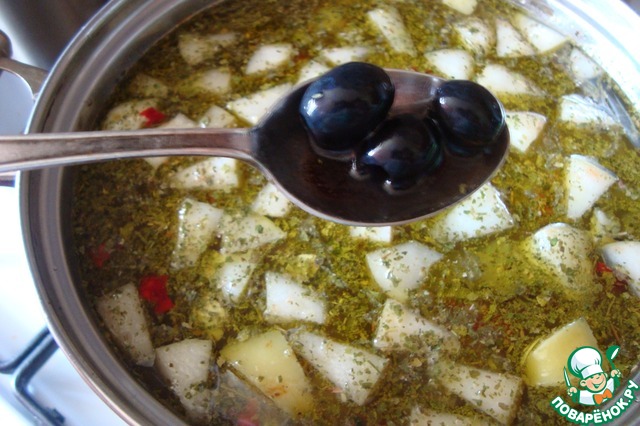 Положила в суп маслины-всего пару ложек. Можно их и не класть. Попробовала на соль и досолила по вкусу. Поварила ещё 3-5 минут и сняла с огня.