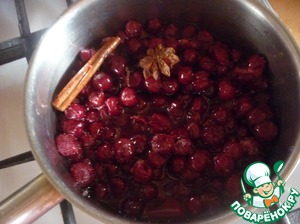 Вишню засыпать сахаром, добавить воды (30-50мл), сахар, корицу и бадьян и держать на огне, пока не растворится сахар. Выключить и отставить. -