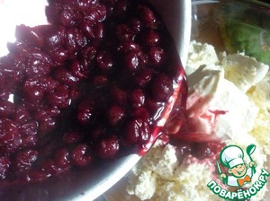 Остальные ягоды с оставшимся сиропом переложить к творогу и взбить. К этой массе добавить разведённый желатин и хорошенько перемешать. -