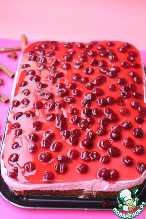 По поверхности разложить отложенную раньше вишню. Желе для торта приготовить по инструкции на упаковке и залить вишню.