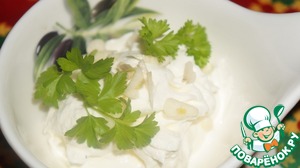 В это время делаем соус. Берем сметану. Мелко рубим чеснок и зелень. Слегка солим. Перемешиваем.