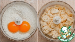 Рубленое тесто удобнее всего готовить в блендере с ножами. Соединяем в чаше блендера муку, соль и перемолотый сахар, затем добавляем масло, нарезанное мелким кубиком (масло должно быть холодным! Можно даже немного подморозить). Включаем блендер и ждем, пока не образуется слегка крошковатая масса. Масло должно равномерно распределиться по всему объёму муки. Затем добавляем желтки, снова перемалываем блендером. должна получиться масса, как на фото справа. Быстро, чтобы масло не успело растаять собираем тесто в шар, заворачиваем в пленку и убираем в хододильник минимум на 1 час (я оставляю на ночь).
