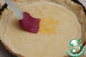 Ставим в разогретую до 180 градусов духовку и выпекаем 15 минут. Теперь маленький секрет: чтобы тесто не сильно размокло от начинки, можно смазать его дно и бортики разболтанным желтком. Убираем бумагу с грузом, смазываем желтком и ставим в духовку буквально на 2 минуты.