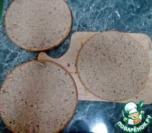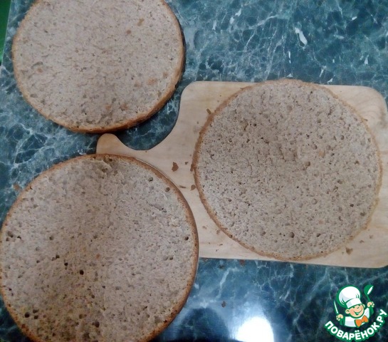Бисквит разрезаем на три коржа и каждый пропитываем вишневым сиропом.