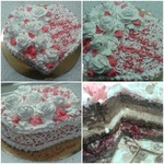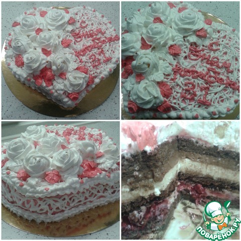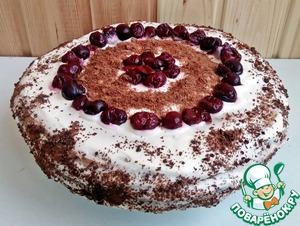 Теперь берем оставшийся белым крем, обмазываем им торт сверху и бока. Украшаем, как подскажет фантазия, отложенной вишней и шоколадной крошкой. Отправляем на ночь в холодильник.