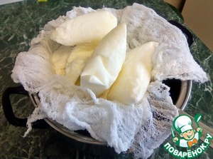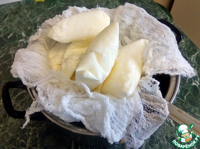 Кефир отправляем на ночь в морозилку. Утром берем кастрюлю и дуршлаг, застилаем марлей в 4 слоя, достаем полностью замороженный кефир и укладываем в дуршлаг. Получается вот такая конструкция. Оставляем размораживаться до вечера. К вечеру получаем домашний нежный творожок/маскарпоне. -