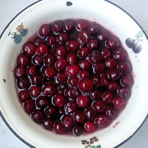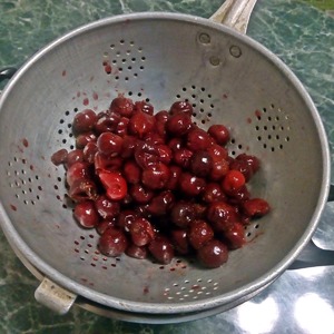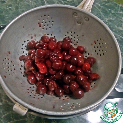 Откидываем вишню на дуршлаг, чтобы сироп стек. -
