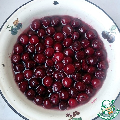 Берем замороженную вишню, посыпаем корицей и заливаем полученным ранее сиропом. Оставляем мариноваться до вечера до сборки торта. -
