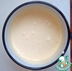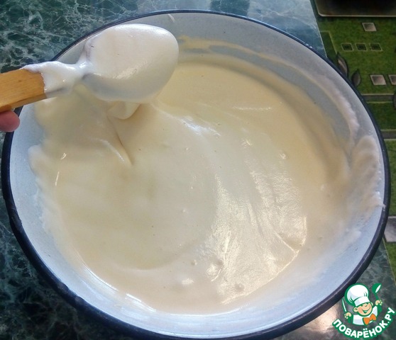 Готовим крем. Берем получившийся творожок и взбиваем около 2 минут. Добавляем понемногу сливки и сахар и взбиваем до растворения сахара.