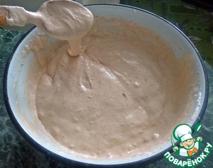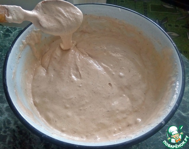 Постепенно всыпаем в яйца полученную сухую смесь, аккуратно перемешивая движениями снизу-вверх. Вливаем заранее растопленное масло и снова аккуратно перемешиваем до однородной массы. Тесто получается как густая сметана.