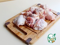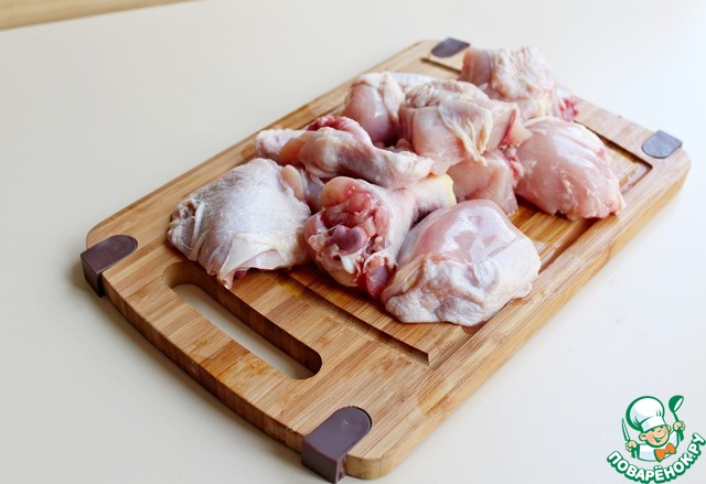 Небольшую курицу, весом примерно 1 кг или чуть более, разделать на порционные кусочки (спинку я оставляю для бульона). Кусочки курицы посолить и поперчить по вкусу. |