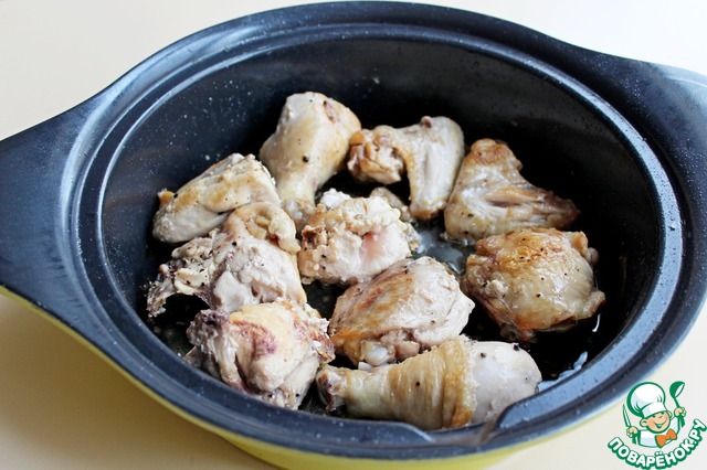 Обжарить курицу на подсолнечном масле до слегка румяной корочки. Вынуть курицу на тарелку. |