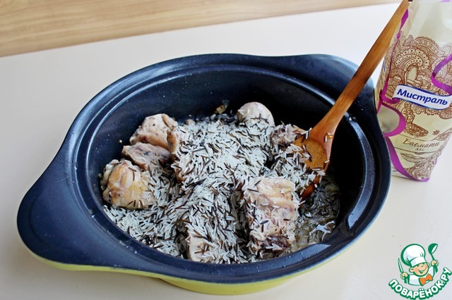 Вернуть в сковороду курицу, добавить рис ТМ Мистраль Басмати микс, перемешать чтобы рис пропитал в себя масло и специи. |