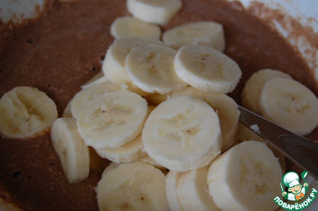 Нарезать бананы и добавить их в массу. Вилкой подавить не слишком мелко. Это важно! Очень приятно ощущать в оладушках кусочки банана.