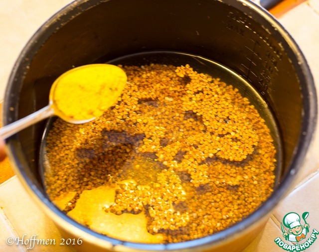 Гречку хорошо моем до прозрачного состояния выливаемой после этого процесса воды. Высыпаем в смазанную в предыдущем шаге чашу мультиварки, солим оставшейся после второго шага частью приправы, либо просто солью, заливаем водой из фильтра в пропорции одна часть гречки две части воды и перемешиваем.
