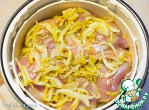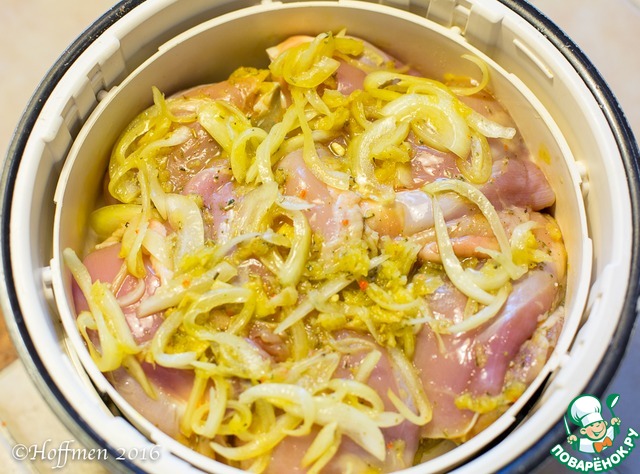 Находим в бескрайних кухонных закромах такую, как правило белую, круглую с дырочками штуку, которую все домашние постоянно перекладывают с места на место и спрашивают друг у друга что это такое. Эта штука должна точно совпадать с верхней частью чаши мультиварки, мало того, она должна в неё беспрепятственно входить. Если Вы редко используете мультиварку, то процентов на 90 эта штука лежит в коробке вместе с ней. Нашли? Отлично! Вставляем это мультиварочное приспособление для варки на пару в чашу мультиварки и аккуратно укладываем в неё промаринованные, или просто посолёно-поперчёные куски курицы в один слой.