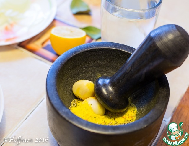 Чеснок с розмарином и любимыми вами приправами расталдыкиваем в ступке. (Если Вы решили не морочиться с маринованием курицы, то этот шаг можете пропустить, и смело переходить к следующему шагу после описания маринада). Солёную приправу вытряхиваем в ступку не всю - гречку-то тоже надо будет солить, правильно?