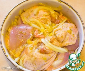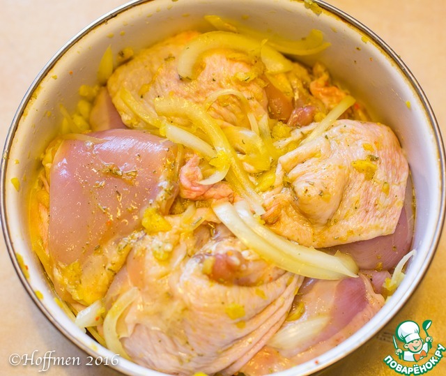 Моем куски курицы, сдираем с них кожу (шаг добровольный - если не хотите можете не сдирать) сушим её салфетками, кладём в небольшую ёмкость, вытряхиваем на неё содержимое ступки, измельчённый лук и крошим туда же лимон хорошо перемешиваем, стараясь подружить все компоненты с курицей, и на часок забываем. Для тех, кто торопится, или просто решил не парится с маринадом - просто солим курицу, посыпаем её приправами и хорошо перемешиваем )